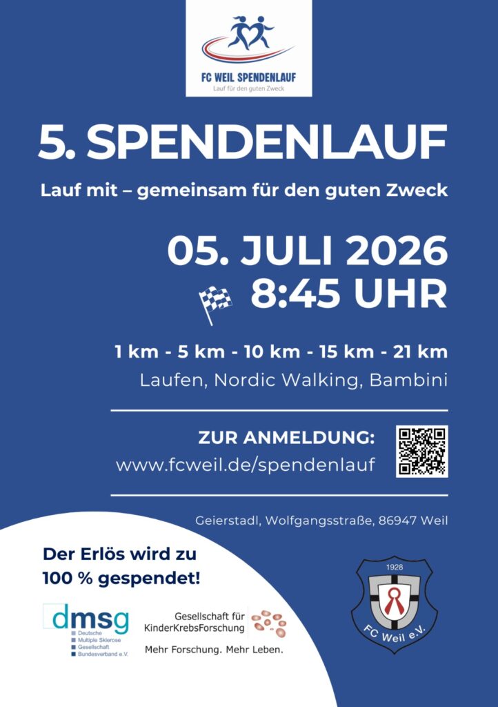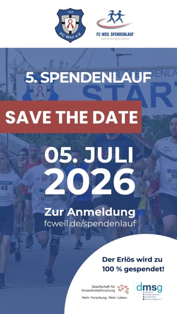 Meldet euch an für den Spendenlauf beim FC Weil am 05.07.2026! Das Startgeld fließt zu 100% dem guten Zweck zu.